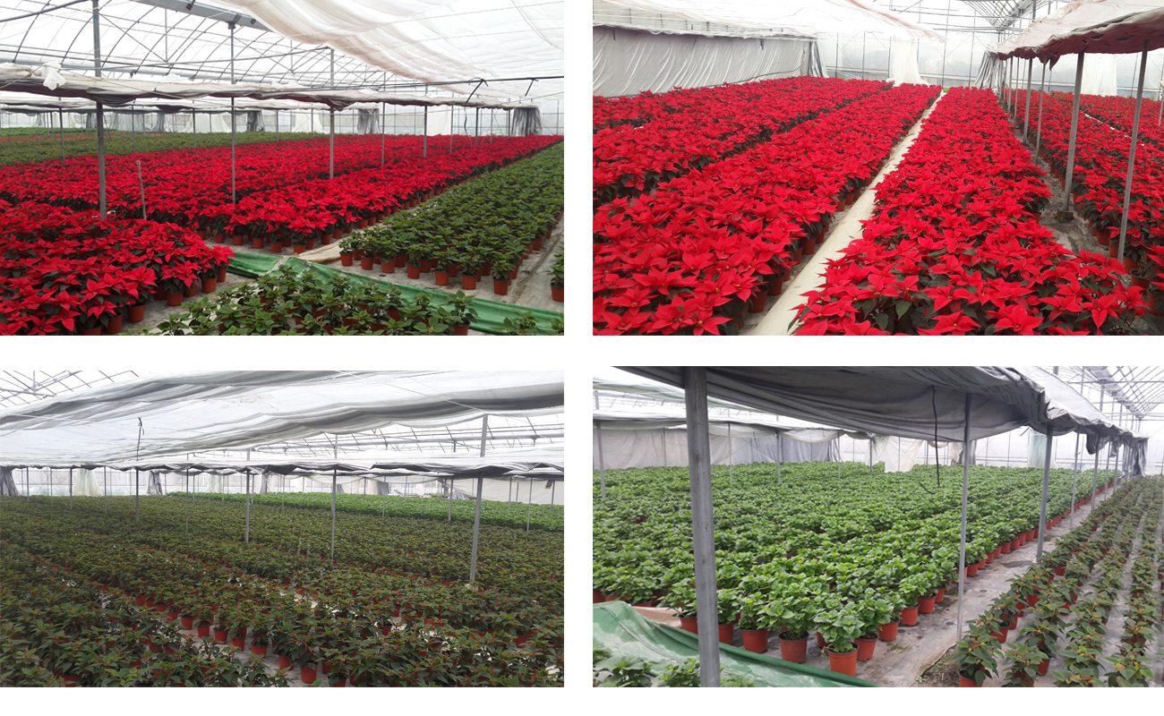 現(xiàn)在天潤(rùn)采用溫室大棚種植,每年產(chǎn)出幾十萬(wàn)盆一品紅,年產(chǎn)值超300萬(wàn)!